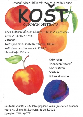 Ovocný košt destilátů v kulturním domě Chlum, vstupné: koštuju a mám vzorek: 100 Kč, koštuju a nemám vzorek: 200 Kč, nekoštuju: zdarma, čeká na vás: hodnocení vzorků, občerstvení, soutěže, dobrá slivovice. Soutěžní vzorky v 0,5l láhvi popsané jménem a ovocem vozte na Chlum 38 do 16. 3. 2025, informace na tel.: 775 639 077