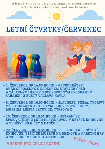 22. července od 15.00 hodin proběhne v letovické dětské knihovně Deskohraní. Děti se mohou těšit na deskové a karetní hry pro větší i menší a  fantasy workshop Magic the gathering.