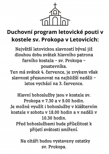 Letovická pouť v kostele sv. Prokopa v Letovicích. Duchovní program letovické pouti v kostele sv. Prokopa v Letovicích: Největší letovickou slavností býval již dlouhou dobu svátek hlavního patrona farního kostela – sv. Prokopa – poustevníka. Ten má svátek 4. července, je zvykem však slavnost přesunovat na nejbližší neděli – letos vychází na 3. července. Hlavní bohoslužby jsou v kostele sv. Prokopa v 7.30 a v 9.00 hodin Je možné využít i bohoslužby v klášterním kostele v sobotu v 18.00 hodin a v neděli v 10.30 hodin Před bohoslužbami bude příležitost k přijetí svátosti smíření. Na oltáři budou vystaveny ostatky sv. Prokopa, více info na: http://farnost.katolik.cz/letovice/
