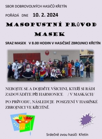 Přijměte pozvání na masopustní průvod masek v Křetíně, sraz masek v 8.00 hodin v hasičské zbrojnici Křetín, po průvodu následuje posezení v hasičské zbrojnici, srdečně zvou hasiči.