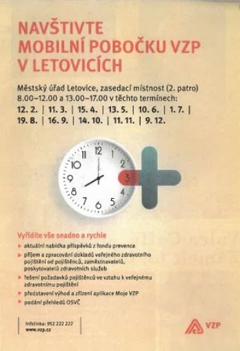 Navštivte mobilní pobočku VZP v Letovicích v čase: 08.00-12.00, 13.00-17.00 hodin, vyřídíte vše snadno a rychle: podání přehledů OSVČ, řešení požadavků pojištěnců ve vztahu k veřejnému zdravotnímu pojištění, představení výhod a zřízení aplikace Moje VZP, příjem a zpracování dokladů veřejného zdravotního pojištění, aktuální nabídka příspěvků z fondu prevence, Městský úřad Letovice, zasedací místnost (2. patro)