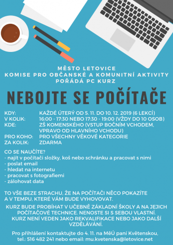 PC kurz pro všechny věkové kategorie se bude konat každé úterý od 15. listopadu do 10. prosince vždy od 16:00 do 17:30 hodin v učebně základní školy v Letovicích. Naučíte se zde zálohovat data, pracovat s fotografiemi, hledat na internetu, poslat email, najít v počítači složky, koš nebo schránku a pracovat s nimi. To vše zcela beze strachu, že na počítači něco zkazíte. Nenoste si nic svého, veškerá technologie je zajištěna. Pro přihlášení kontaktujte paní Květenskou na MěÚ, tel.: 516 482 241, email: mu.kvetenska@letovice.net, a to nejpozději do 4. listopadu 2019.