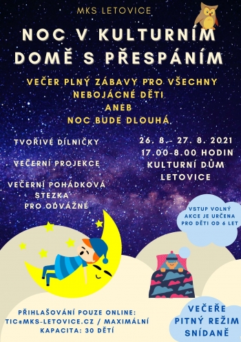 Pro všechny nebojácné děti bude ve čtvrtek 26. 8. 2021 připravena zábavná akce s názvem Noc v Kulturním domě s přespáním. Odvážní nocležníci se vydají na večerní pohádkovou stezku, chybět nebudou tvořivé dílničky, kde si vyrobíme opravdové bylinkové mýdlo. Před spaním se děti mohou těšit na večerní projekci. Večeře, snídaně i pitný režim bude zajištěn. Přihlašování pouze online na e-mail: tic@mks-letovice.cz, uvádějte prosím jméno, věk dítěte a telefonický kontakt na zákonného zástupce.