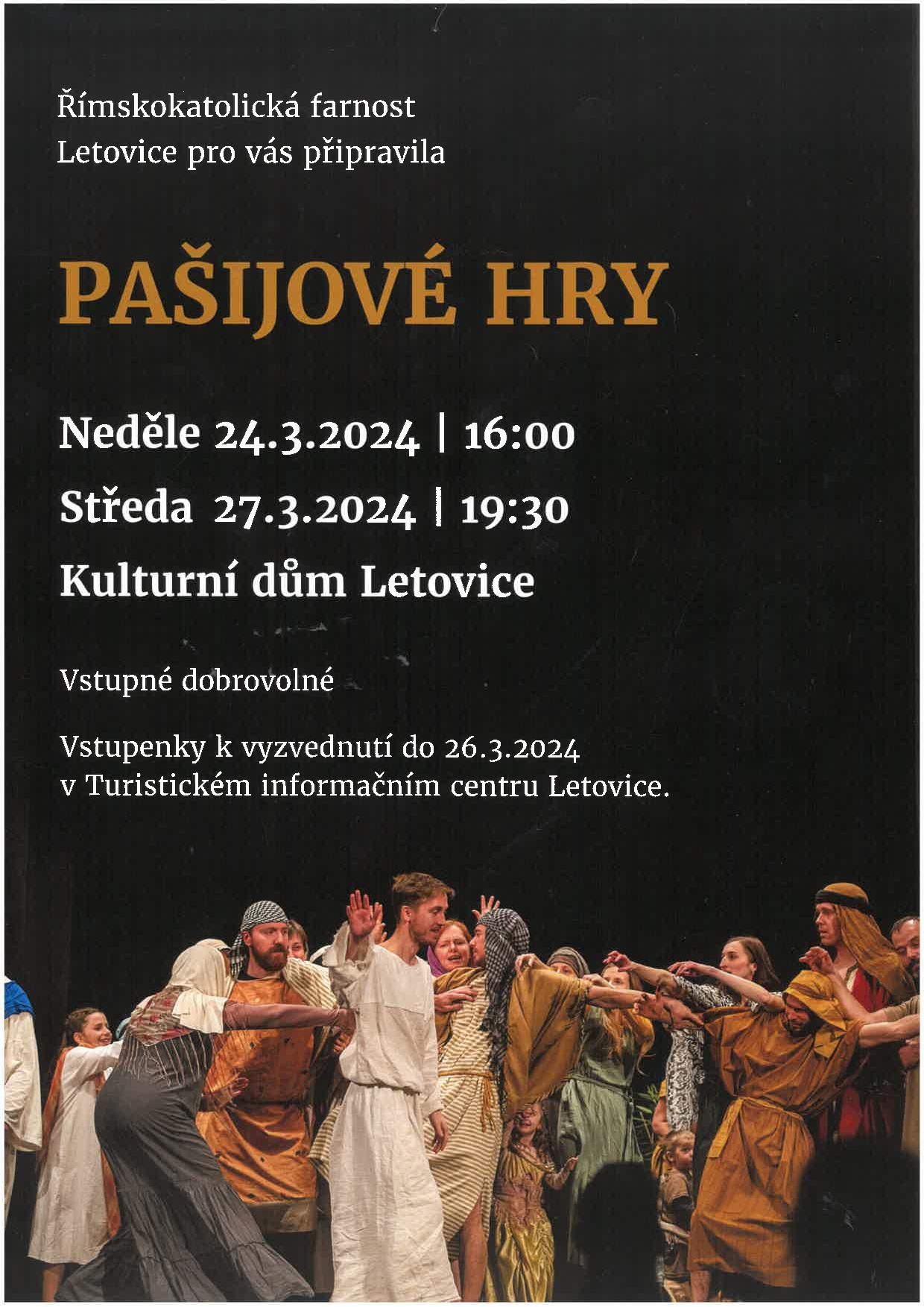 Římskokatolická farnost Letovice připravila divadelní představení Pašijové hry, které se uskuteční v Kulturním domě v Letovicích, a to v neděli 24. 3. 2024 od 16.00 hodin a ve středu 27. 3. 2024 od 19.30 hodin. Vstupenky jsou k vyzvednutí v Turistickém infomačním centru Letovice, vstupné dobrovolné.