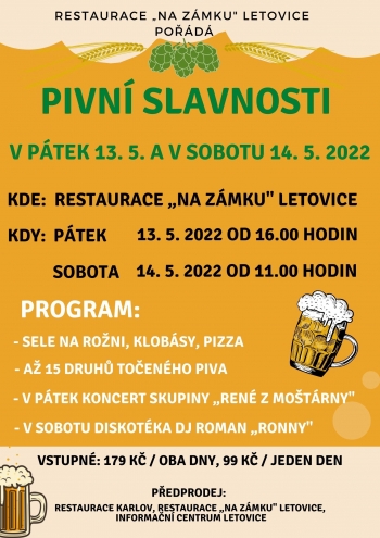 Restaurace „Na Zámku" v Letovicích Vás srdečně všechny zve na PIVNÍ SLAVNOSTI. Začátek slavností proběhne v pátek 13. 5. od 16.00 hodin a v sobotu 14. 5. 2022 od 11.00 hodin. Těšit se můžete na 15 druhů točeného piva, selátko, klobásky, chybět nebude ani pizza. V pátek k tanci a poslechu hraje “Rebel z Moštárny”, sobotu se můžete těšit na diskotéku s DJ Roman “RONNY”,. Vstupné: 179 Kč / oba dny, 99 Kč / jeden den. Vstupenky v předprodeji k zakoupení v restauraci Karlov, v restauraci „Na Zámku" Letovice a Turistickém informačním centru Letovice.
