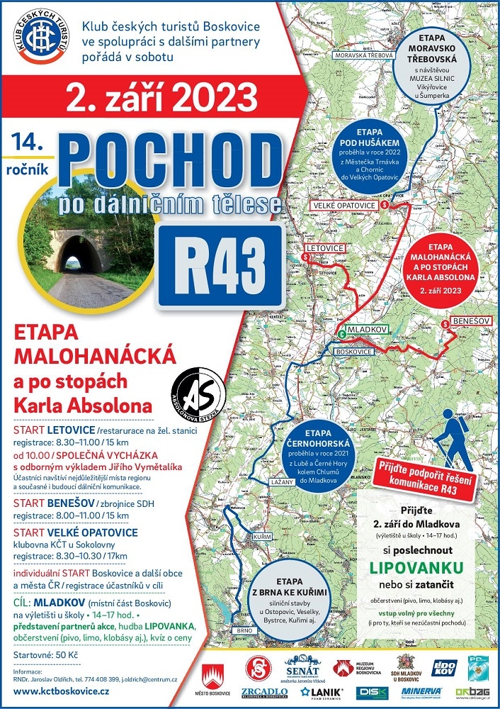 Klub českých turistů Boskovice ve spolupráci s dalšími partnery Vás srdečně zve 2. září 2023 na 14. ročník Pochodu po dálničním tělese R43.