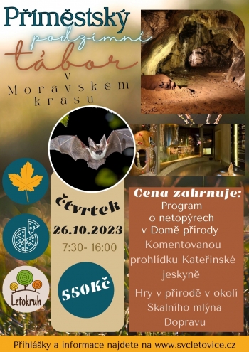 V podzimním prostředí Moravského krasu si užijeme program o netopýrech v Domě přírody vedený přírodovědcem. Součástí programu je prohlídka části expozice s netopýry, hry a tématicky zaměřené aktivity venku. Oběd bude zajištěn, zahrajeme si hry v okolí Skalního mlýna a přesuneme se na komentovanou prohlídku Kateřinské jeskyně.