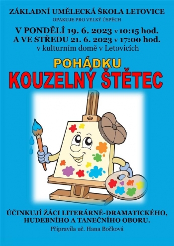 ZUŠ Letovice pro velký úspěch opakuje pohádku Kouzelný štětec, ve kterém účinkují žáci Literárně-dramatického oboru tř. paní učitelky Hany Bočkové, představení se uskuteční v Kulturním domě v Letovicích, www.zusletovice.cz