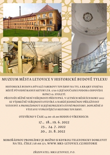 Pozvánka na mimořádné prohlídky Muzea města Letovice v historické budově Tylexu