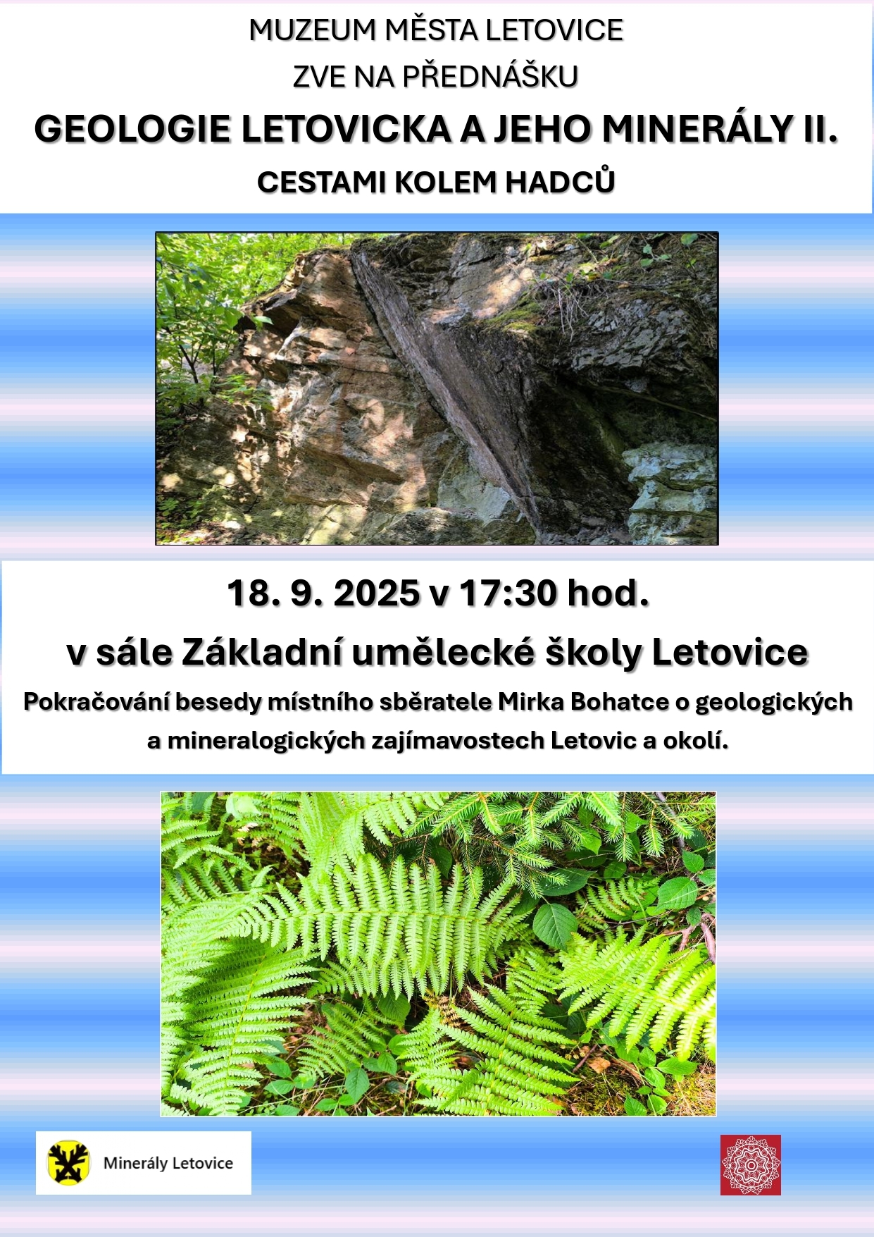 Přijměte pozvání na přednášku sběratele Mirka Bohatce s názvem Přednáška Geologie Letovicka a jeho minerálů o geologických a mineralogických zajímavostech Letovic a okolí.