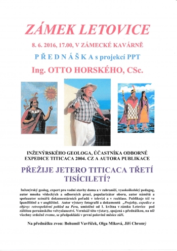 Zámek Letovice srdečně zve na přednášku Ing. Otto Horského, CSc., inženýrského geologa, účastníka odborné expedice Titicaca 2004, autora mnoha vědeckých a odborných prací. Přednáška doplňuje autorovu výstavu fotografií a dokumentů "Projekty, expedice a objevy: retrospektivní pohled na Peru", která je od května do října umístěna na Zámku Letovice.