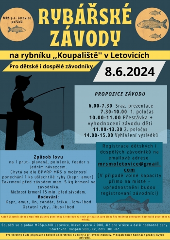Rybářské závody na rybníku „Koupaliště v Letovicích, pro dětské i dospělé závodníky. Propozice závodu: 6.00+7.30 hodin: sraz, prezentace, 7.30-10.00 hodin – 1. poločas, 10.00-11.00: přestávka + vyhodnocení závodu dětí, 11.00-13.30: 2. poločas, 14.00-15.00 hodin – vyhlášení výsledků, registrace dětských i dospělých závodníků: mrsmoletovice@gmail.com, připraveno bude bohaté občerstvení z udírny a grilované makrely, v dopoledních hodinách prodej živých pstruhů