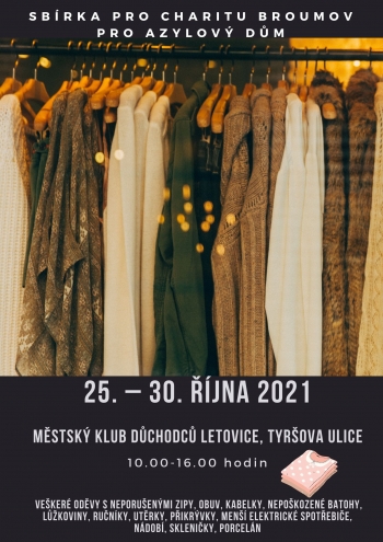 Městský klub důchodců Letovice pořádá ve dnech 25. – 30. října 2021 sbírku šatstva, obuvi, knih, hraček, nádobí a malých elektrospotřebičů pro Charitu Broumov, pobočka Blansko. Nosit můžete například: veškeré oděvy s neporušenými zipy, obuv, kabelky, nepoškozené batohy, lůžkoviny, ručníky, utěrky, přikrývky, menší elektrické spotřebiče, nádobí, skleničky, porcelán.