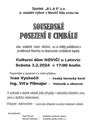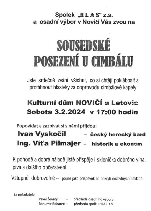 Přijměte pozvání na sousedské posezení u cimbálu v kulturním domě v Novičí. O dobrou náladu se postará Ivan Vyskočil (český herecký bard) a Ing. Víťa Pilmajer (historik a ekonom) v doprovodu cimbálové muziky, vstupné dobrovolné