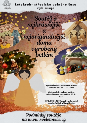 Letokruh - SVČ Letovice vyhlašuje soutěž o nejkrásnější a nejoriginálnější doma vyrobený betlém. Výstava betlémů proběhne v přízemí budovy Letokruhu od 1. do 17. 12. 2021. Vlastnoručně vyrobené betlémy odevzdávejte v kanceláři Letokruhu do 23. 11. 2021. Dne 17. 12. 2021 proběhne slavnostní vyhlášení vítězů, kteří budou odměněni. Více o podmínkách soutětě na www.svcletovice.cz.