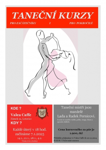 Přijměte pozvání na Taneční kurzy pro začátečníky i pokročilé, které se uskuteční vždy v úterý od 18.00 hodin, a to v tyto termíny: 7. 1., 14. 1., 21. 1., 28. 1., 4. 2. 2025 v areálu Valea Caffe, Zámek 1a. Kurzem vás provedou taneční mistři Lada a Radek Pernicovi, naučí vás valčík, polku, tango, blues a spoustu dalších.