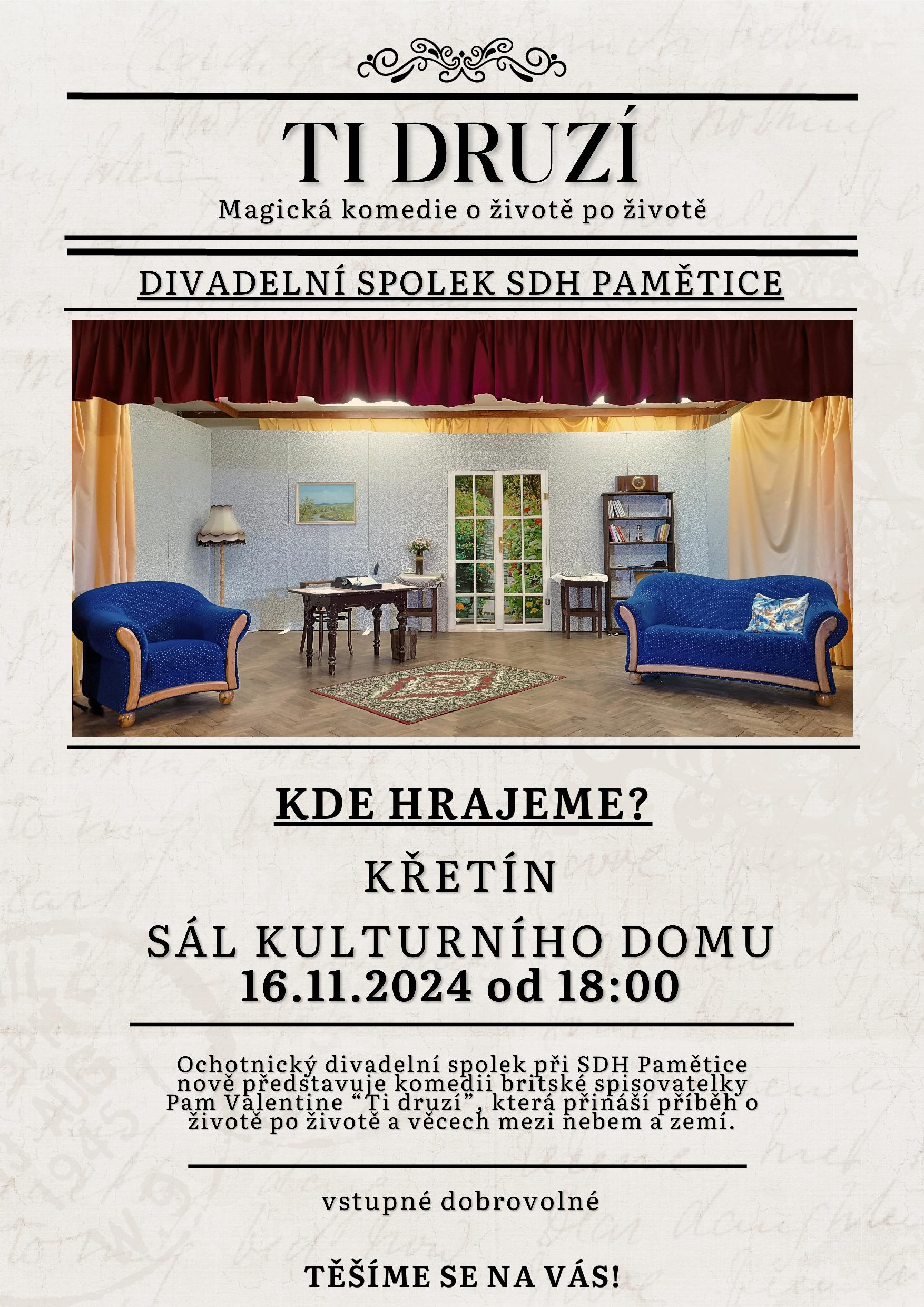 Přijměte pozvánku na divadelní představení mírně duchařské komedie britské autorky Pam Valentine „Ti druzí" v podání ochotnického Divadelního spolku při SDH Pamětice. Hraje se v sobotu 16. listopadu 2024 v kulturním domě v Křetíně od 18.00 hodin. Tato komedie přináší příběh o životě po životě a věcech mezi nebem a zemí.