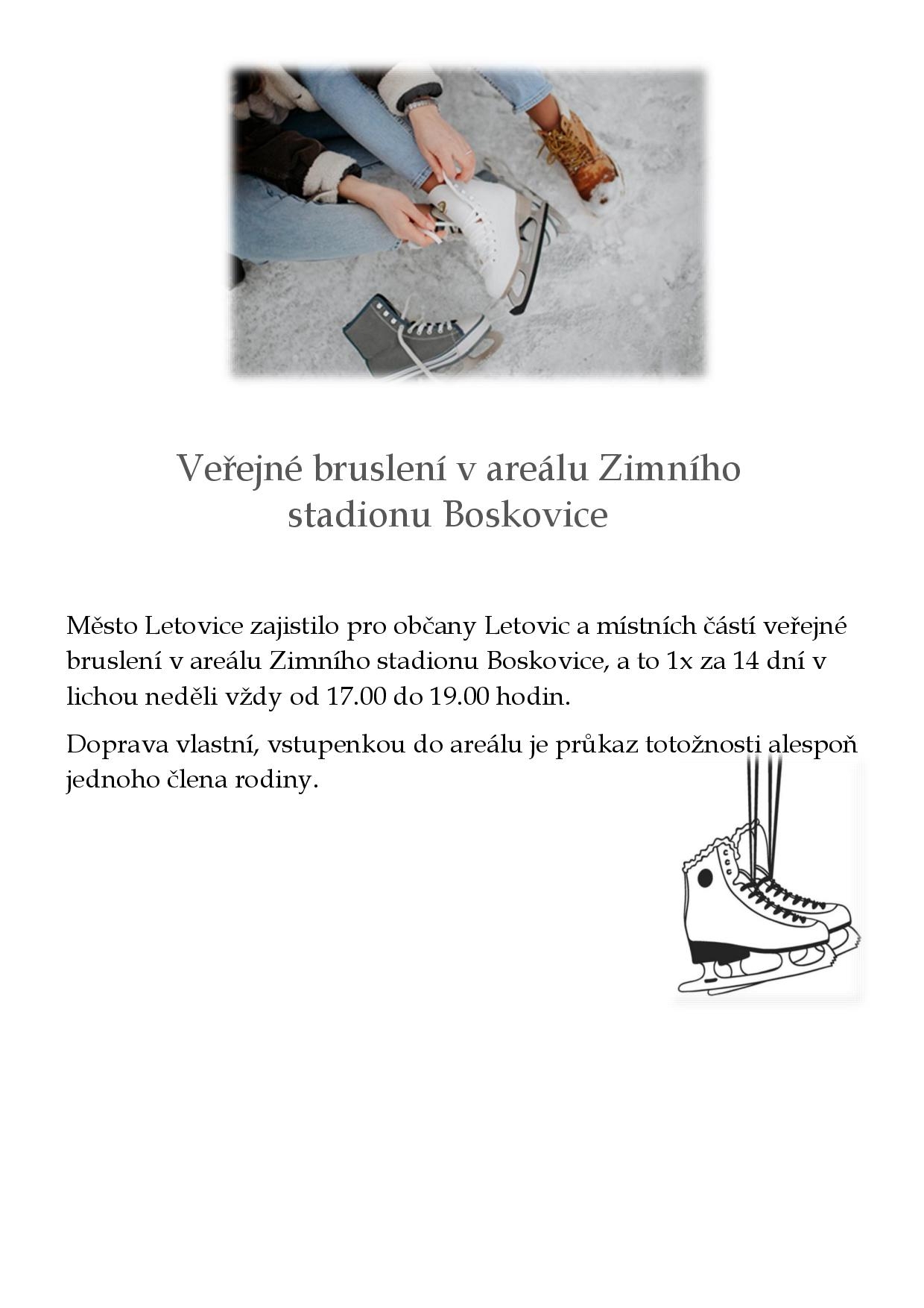 Město Letovice zajistilo pro občany Letovic a místních částí veřejné bruslení v areálu Zimního stadionu Boskovice, a to 1x za 14 dní v lichou neděli vždy od 17.00 do 19.00 hodin.