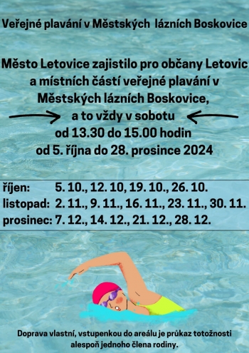 Veřejné plavání v Městských lázních Boskovice. Město Letovice zajistilo pro občany Letovic a místních částí veřejné plavání v Městských lázních Boskovice, a to vždy v sobotu od 13.30 do 15.00 hodin – tj. od 5. 10. 2024 do 28. 12. 2024. Doprava vlastní, vstupenkou do areálu je průkaz totožnosti alespoň jednoho člena rodiny.