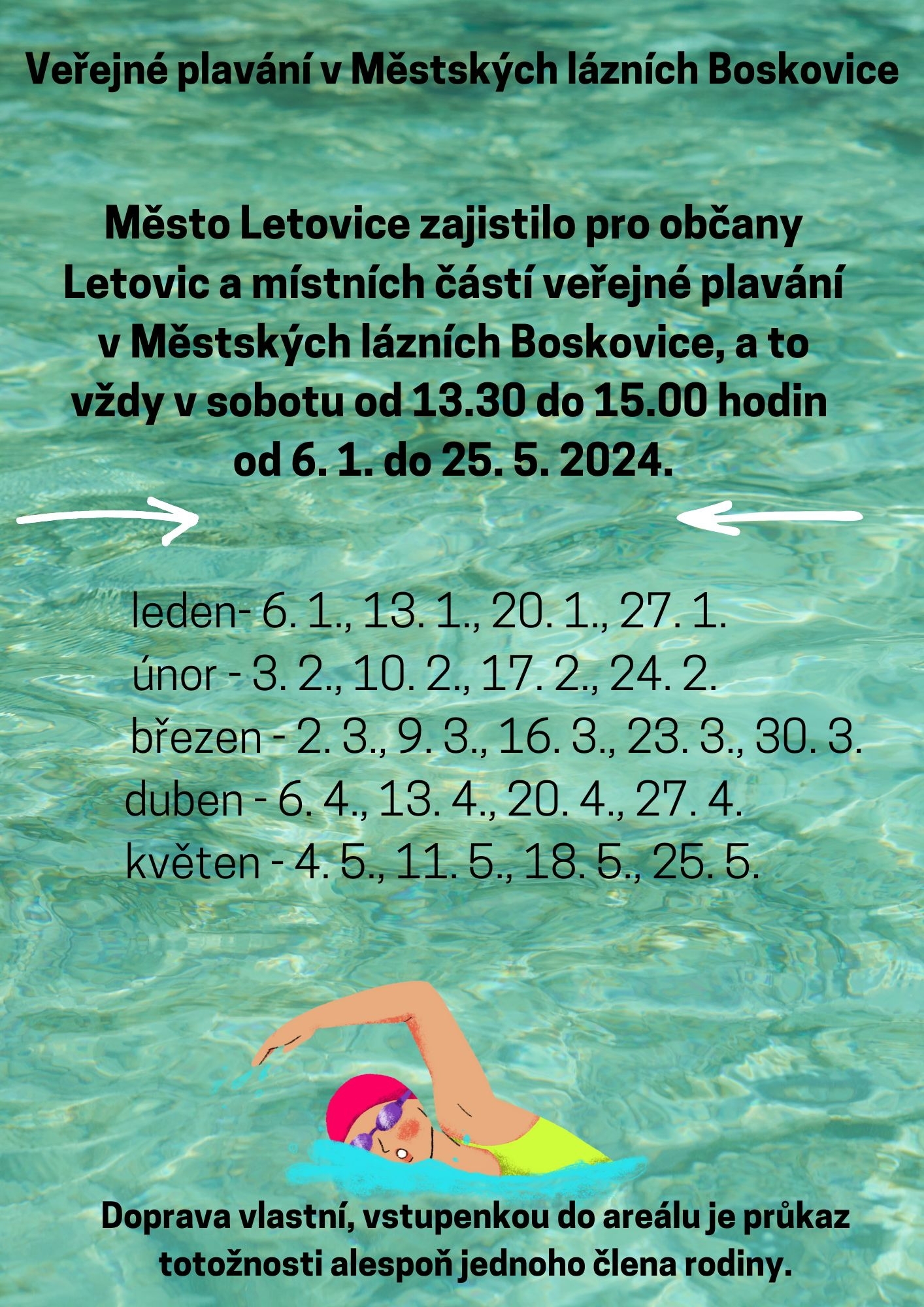 Město Letovice zajistilo pro občany Letovic a místních částí veřejné plavání v Městských lázních Boskovice, a to vždy v sobotu od 13:30 do 15:00 hodin - tj. od 6.1. 2024 do 25.5. 2024. Doprava vlastní, vstupenkou do areálu je průkaz totožnosti alespoň jednoho člena rodiny.