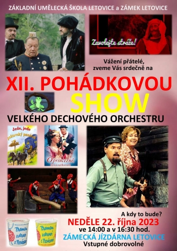 Velký dechový orchestr Letovice opět vystoupí se svojí skvělou show na Zámecké jízdárně v Letovicích, vstupné dobrovolné, vybírat můžete ze dvou časů, a to ve 14.00 a 16.30 hodin.