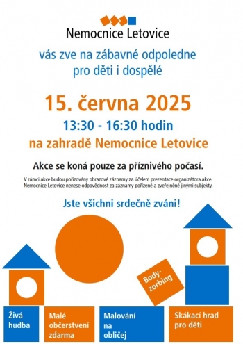 Přijměte pozvání na zábavné odpoledne pro děti i dospělé na zahradě Nemocnice Letovice, těšit se můžete na živou hudbu, malé občerstvení zdarma, malování na obličej, skákací hrad pro děti
