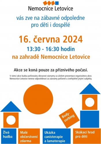 Zábavné odpoledne pro děti i dospělé na zahradě Nemocnice Letovice, těšit se můžete na živou hudbu, malé občerstvení zdarma, ukázku canisterapie a lamaterapie, skákací hrad pro děti. Akce se koná pouze za příznivého počasí