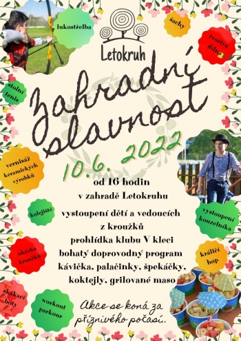 Akce v pátek 10. června od 16 hodin v zahradě Letokruhu s mnoha zábavnými aktivitami, s vystoupeními dětí a vedoucích z kroužků. Můžete se těšit na vernisáž keramických výrobků, králičí hop, tvořivou dílnu, výstavu kolejiště, workout, lukostřelbu, parkour a stolní tenis. Čeká vás i lákavé občerstvení - opékání špekáčků, grilování masa, koktejly, palačinky, kávička a další. Jste srdečně zváni!