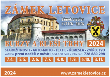 Oblíbená zámecká burza starožitností a sběratelských kuriozit se koná vždy první neděli v měsíci, t.j.: 7. 4., 5. 5., 2. 6., 7. 7., 4. 8., 1. 9., 6. 10., 3. 11. 2024