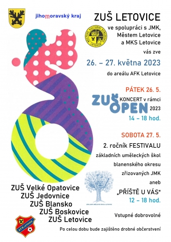V pátek 26. 5. v čase 14.00-18.00 koncert v rámci ZUŠ OPEN v areálu AFK Letovice, v sobotu 27. 5. v čase 12.00-18.00 hodin 2. ročník festivalu ZUŠ blanenského okresu zřizovaných JMK aneb „Příště u vás".