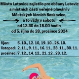 Plavání pro občany Letovic v Boskovicích. Město Letovice zajistilo pro občany Letovic a místních částí plavání v Městských lázních Boskovice. Pronájem lázní je pro město Letovice každou sobotu od 5. října do 28. prosince 2024 vždy od 13.30 do 15.00 hodin. Doprava vlastní, vstupenkou do...