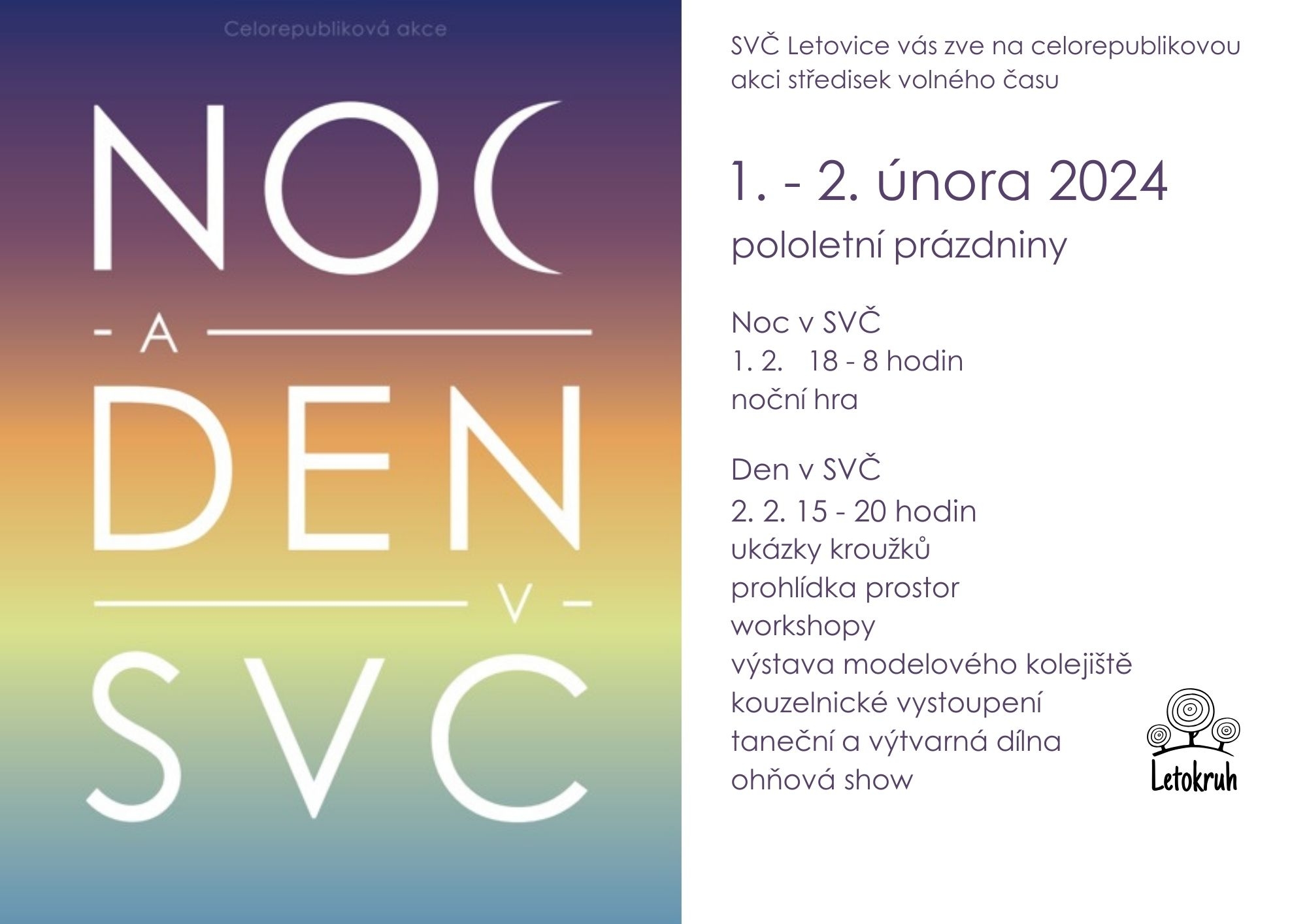 Noc a den v SVČ. Celorepubliková akce, verze "Letokruh". Přijďte se k nám podívat ve čtvrtek 1. a v pátek 2. února 2024. Můžete se těšit na pestrý program plný zábavy i inspirace. Těšit se můžete třeba na ukázky z aktivit kroužků, workshopy, vystoupení, prohlídky prostor, výstavu modelového kolejiště, ohňovou show a jiné. Podrobnější informace o programu zveřejníme týden před akcí.