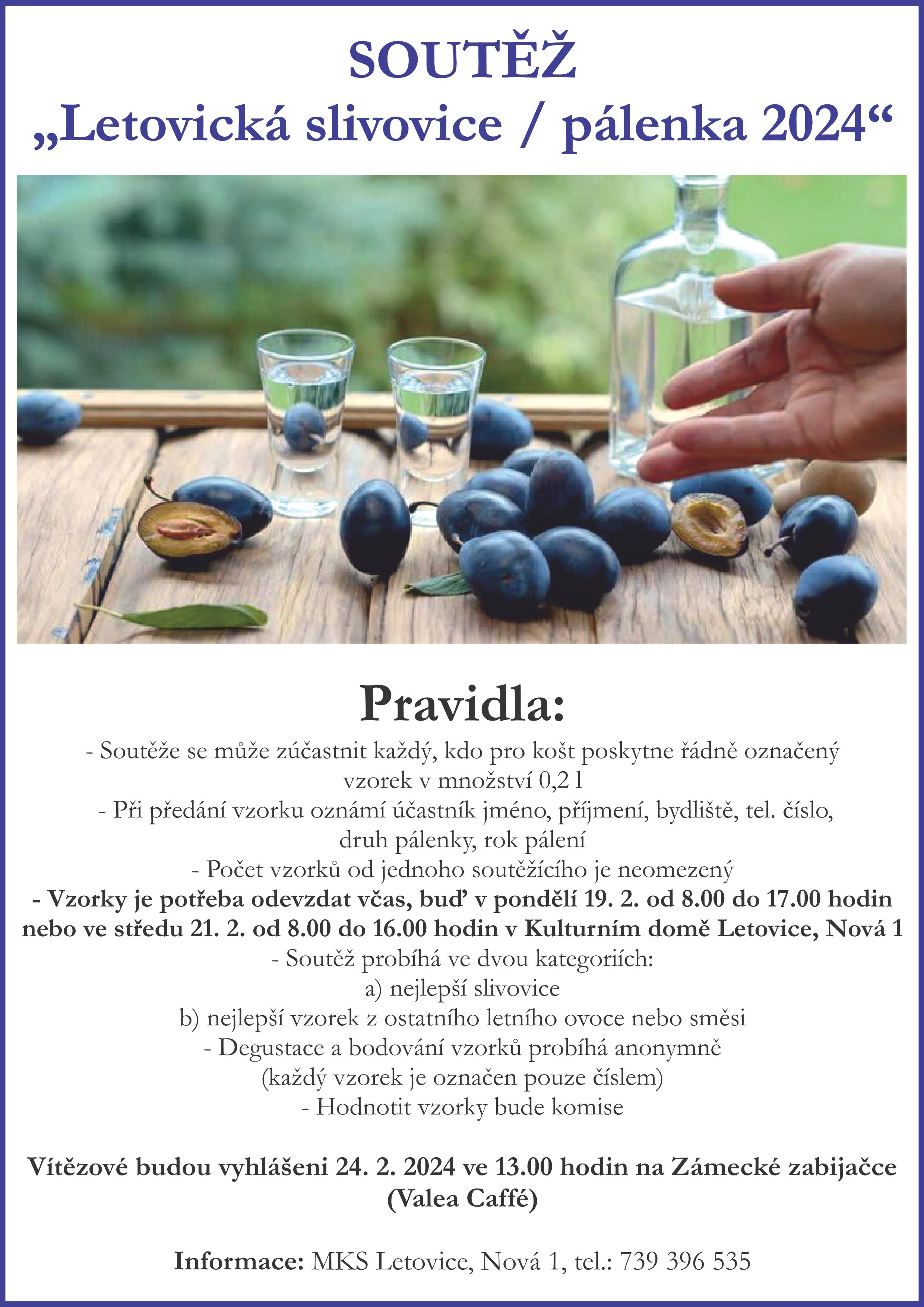 Součástí akce bude vyhodnocení soutěže "Letovická slivovice / pálenka 2024"