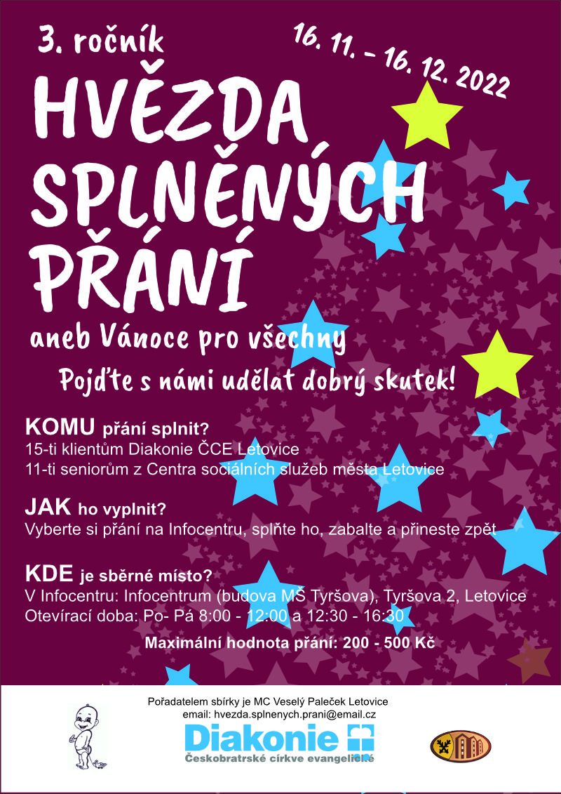 I letos můžete udělat dobrý skutek a zapojit se opět do oblíbeného počinu Hvězda splněných přání. Přijďte si k nám do infocentra utrhnout z vánočního stromečku přání, které někomu vykouzlí úsměv na tváři. Vybrat si můžete z přání klientů Diakonie ČCE Letovice a seniorů z Centra sociálních služeb města Letovice. Přání si vyberete u nás v infocentru, splníte, zabalíte, popíšete a donesete zpět. Hodnota přání: 200-500 Kč.