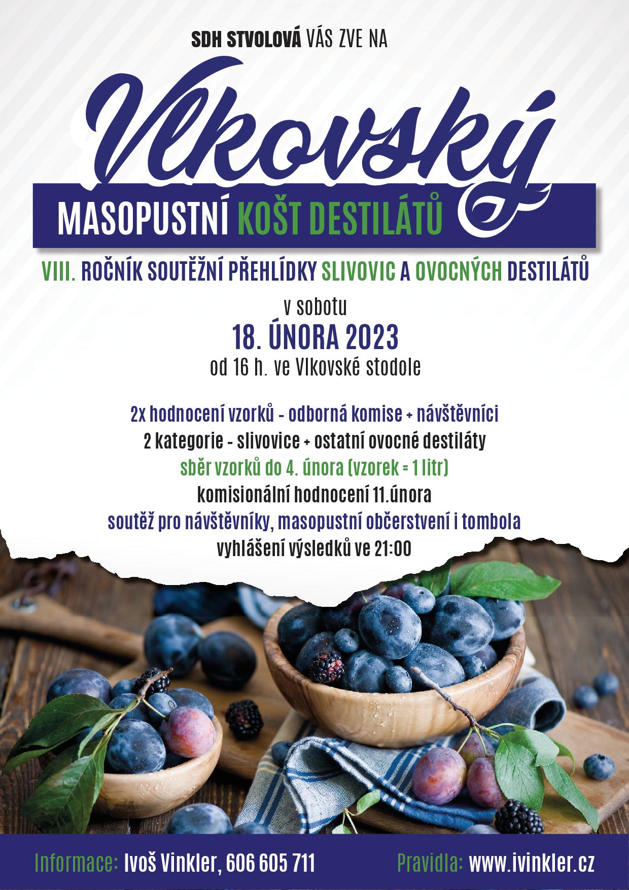 Přijměte pozvání na oblíbený Vlkovský košt destilátů. Sběr vzorků probíhá do 4. února 2023 (vzorek = 1 l), komisionální hodnocení se uskuteční 11. února 2023, soutěž proběhne ve dvou kategoriích: slivovice a ostatní ovocné destiláty.