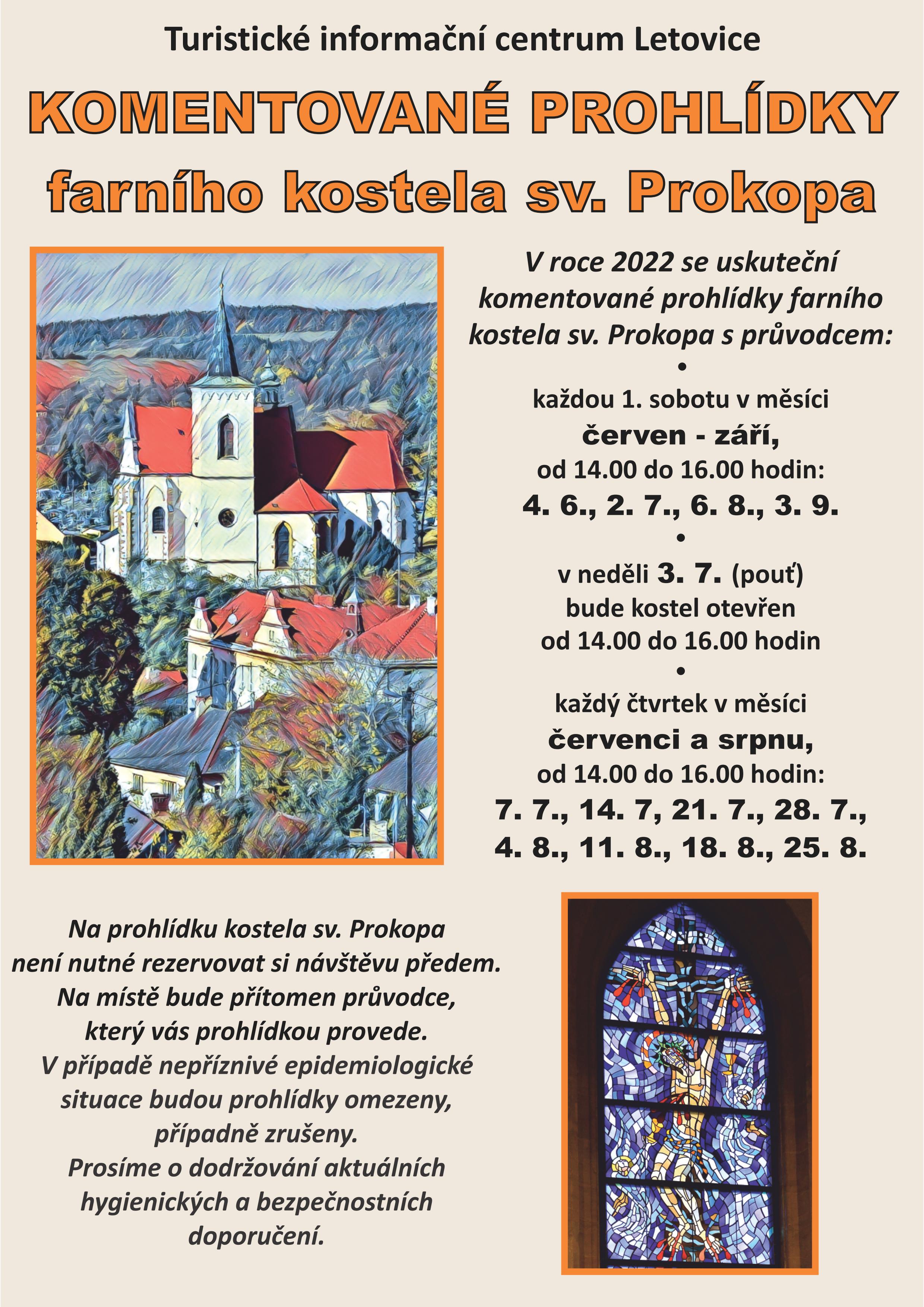 Napsal uživatel tic dne Út, 28/06/2022 - 15:05.Letovická pouť v kostele sv. Prokopa v Letovicích. Duchovní program letovické pouti v kostele sv. Prokopa v Letovicích: Největší letovickou slavností býval již dlouhou dobu svátek hlavního patrona farního kostela – sv. Prokopa – poustevníka. Ten má svátek 4. července, je zvykem však slavnost přesunovat na nejbližší neděli – letos vychází na 3. července. Hlavní bohoslužby jsou v kostele sv. Prokopa v 7.30 a v 9.00 hodin Je možné využít i bohoslužby v klášterním kostele v sobotu v 18.00 hodin a v neděli v 10.30 hodin Před bohoslužbami bude příležitost k přijetí svátosti smíření. Na oltáři budou vystaveny ostatky sv. Prokopa, více info na: http://farnost.katolik.cz/letovice/