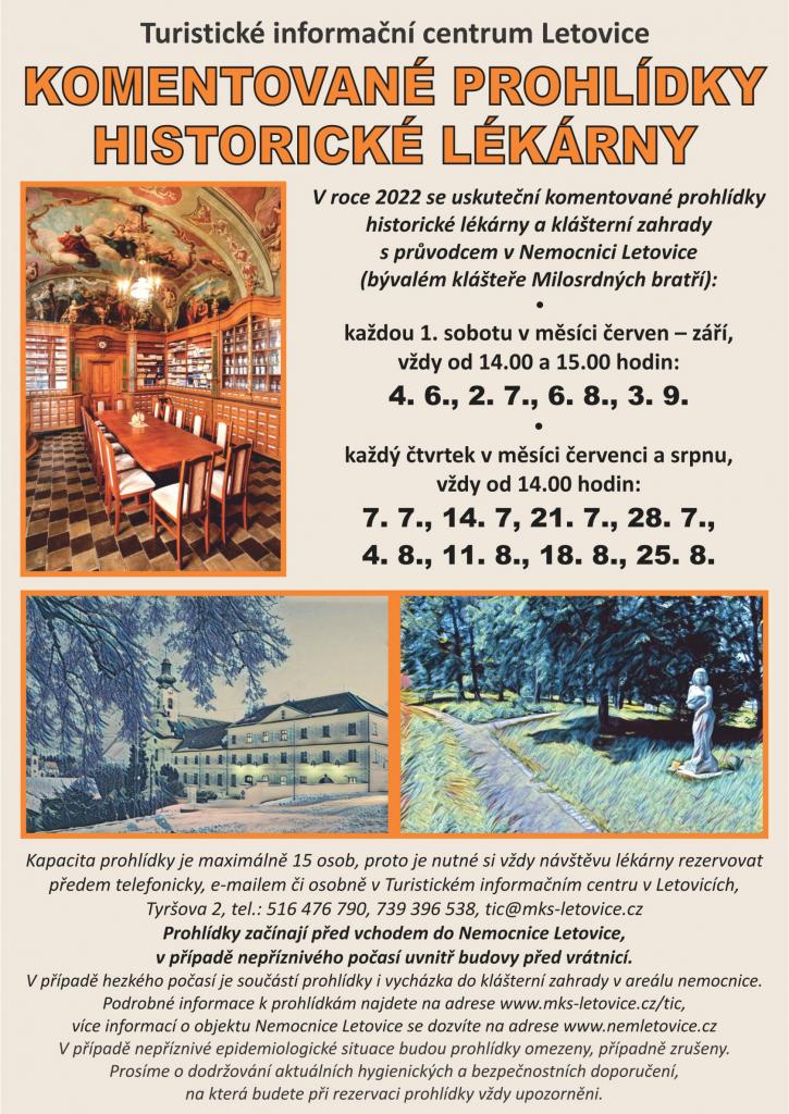 Napsal uživatel tic dne Po, 11/04/2022 - 09:32.Čtvrteční prohlídky historické lékárny v Nemocnici Letovice ve 14.00 hodin. Oblíbené komentované prohlídky zrestaurované barokní lékárny s průvodcem v objektu bývalého kláštera Milosrdných bratří, které zahrnují výklad o historii a vzniku kláštera, návštěvu unikátní zrestaurované barokní lékárny nacházející se v areálu kláštera a prohlídku klášterní zahrady. Trvání prohlídky je zhruba půl hodiny a je zcela zdarma. Vzhledem k omezené kapacitě lékárny je nutné si prohlídku zarezervovat předem v Turistickém informačním centru Letovice, Tyršova 2, tel.: 516 476 790, 739 396 538, e-mail: tic@mks-letovice.cz, www.mks-letovice.cz/tic