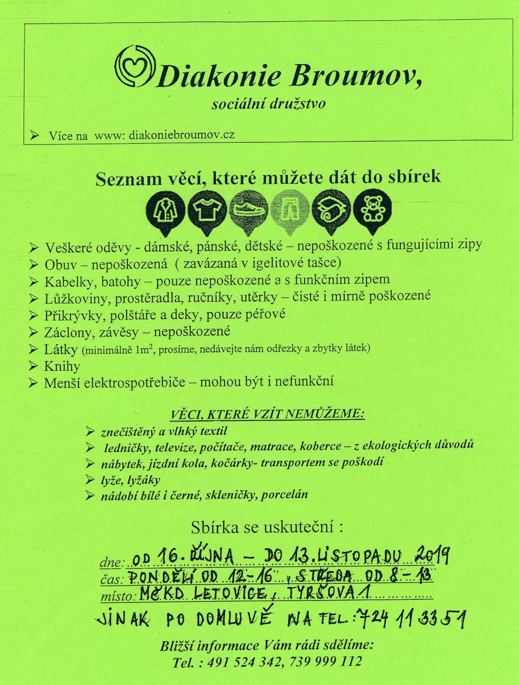 Napsal uživatel tic dne Čt, 12/09/2019 - 14:50.V době od 16. října do 13. listopadu 2019 můžete i vy přispět na dobrou věc. Koná se sbírka pro potřebné, nosit můžete: veškeré oděvy - dámské, pánské dětské (nepoškozené s funkčními zipy), nepoškozenou obuv (zavázanou v igelitové tašce), kabelky, batohy (pouze nepoškozené s funkčním zipem), lůžkoviny, prostěradla, ručníky, utěrky, přikrývky, polštáře, deky, záclony, závěsy, látky (minimálně 1m2), knihy, menší elektrospotřebiče (mohou být i nefunkční). Sbírka se uskuteční 16. 10. - 13. 11. 2019, vždy v pondělí: 12.00-16.00 hodin, ve středu: 8.00-13.00 hodin, jinak po domluvě na tel.: 724 113 351. Sbírka se uskuteční v prostorách Městského klubu důchodců v Letovicích, Tyršova 1. Více informací na: www.diakoniebroumov.cz