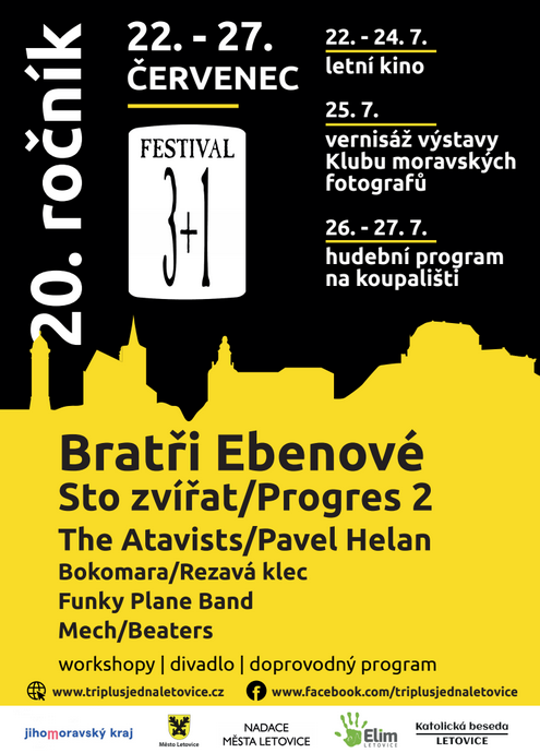 22. 7. – 27. 7. – Festival 3 + 1 Letovice – 20. ročník - Bratři Ebenové, Sto zvířat, Progres 2, The Atavists, Pavel Helan, Bokomara, Rezavá klec, Funky Plane Band, Mech, Beaters.