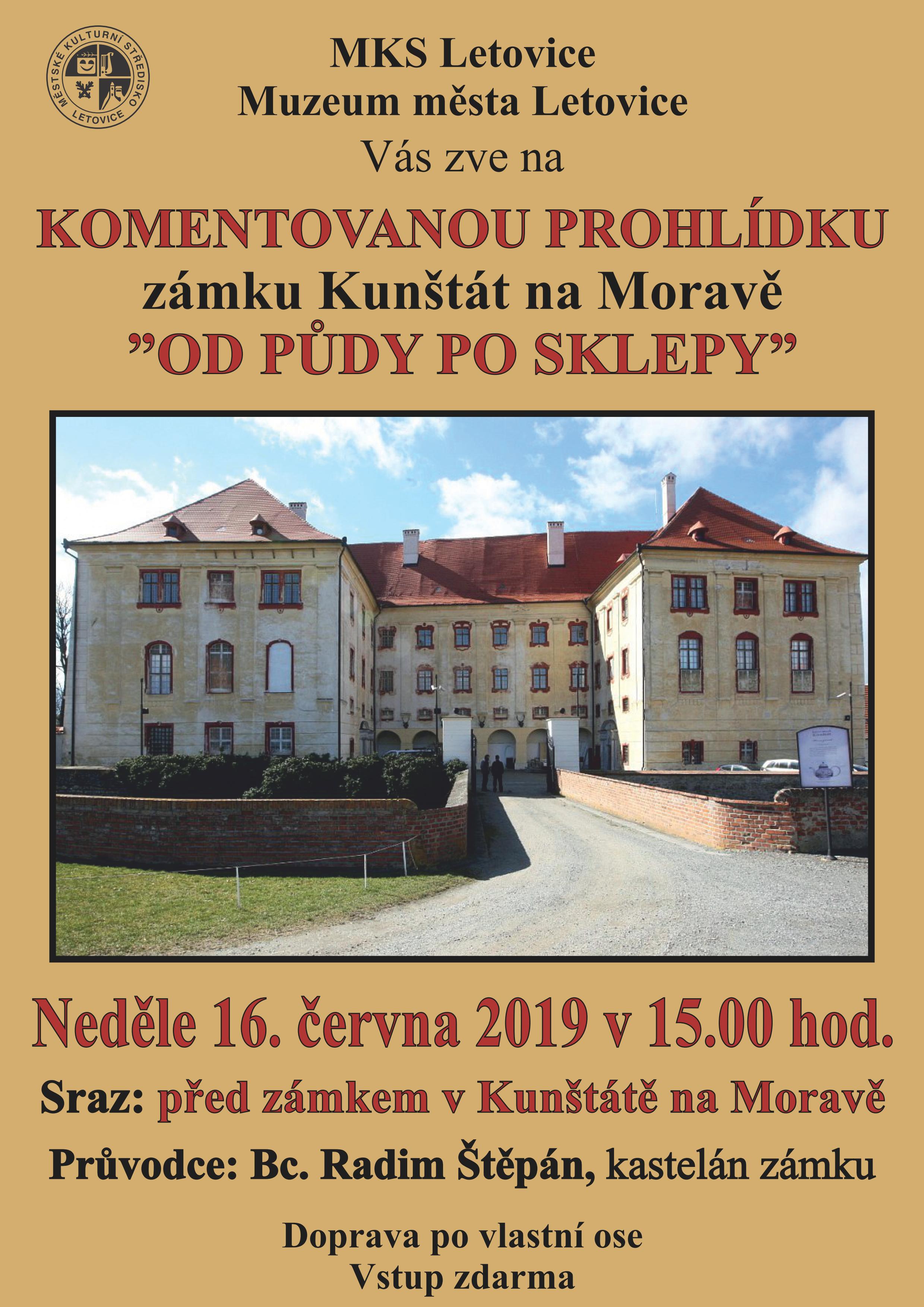 Přijměte pozvání na komentovanou prohlídku zámku Kunštát na Moravě „Od půdy po sklepy", která se uskuteční v neděli 16. června 2019 v 15.00 hodin. Sraz účastníků před zámkem v Kunštátě na Moravě, průvodcem vám bude kastelán zámku Bc. Radim Štěpán.