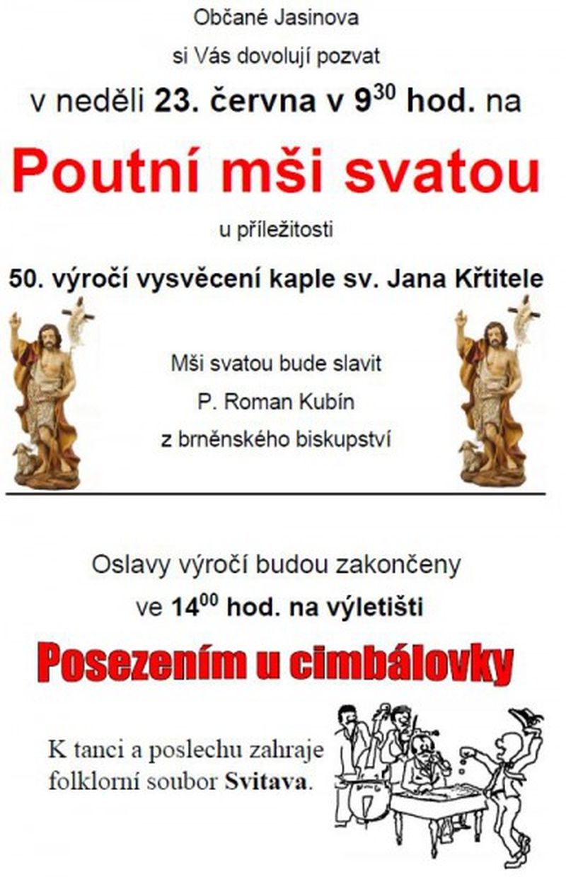 Občané Jasinova zvou na Poutní mši svatou u příležitosti 50. výročí vysvěcení kaple sv. Jana Křtitele, kterou bude slavit P. Roman Kubín z brněnského biskupství.