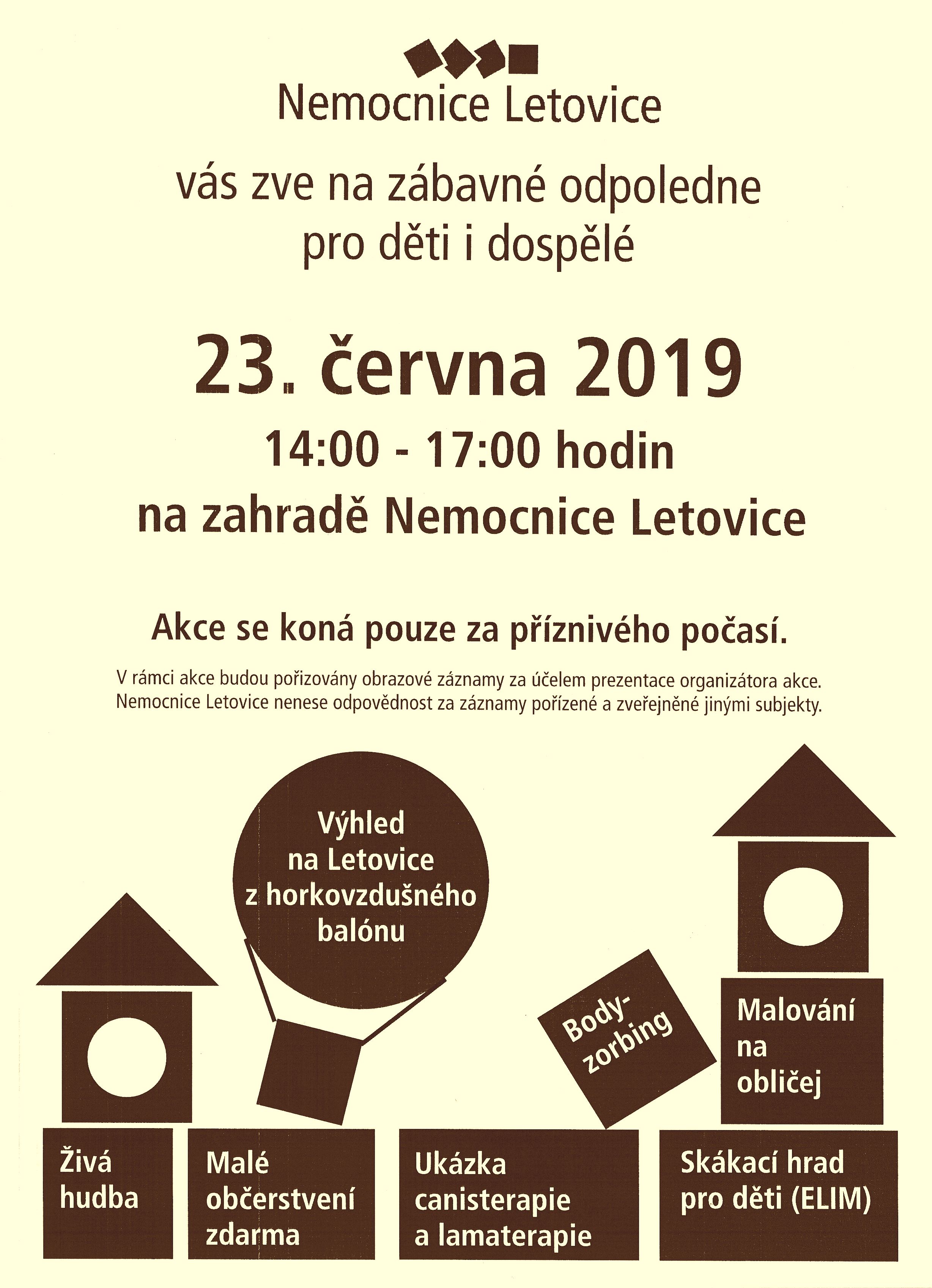 Zábavné odpoledne pro děti i dospělé na zahradě Nemocnice Letovice. Pro děti bude připraven skákací hrad, malování na obličej, body-zorbing, ukázka canisterapie a lamaterapie, k dobré náladě zahraje živá hudba a Letovice můžete shlédnout z horkovzdušného balónu. Akce se koná pouze za příznivého počasí, info@nemletovice.cz, www.nemletovice.cz