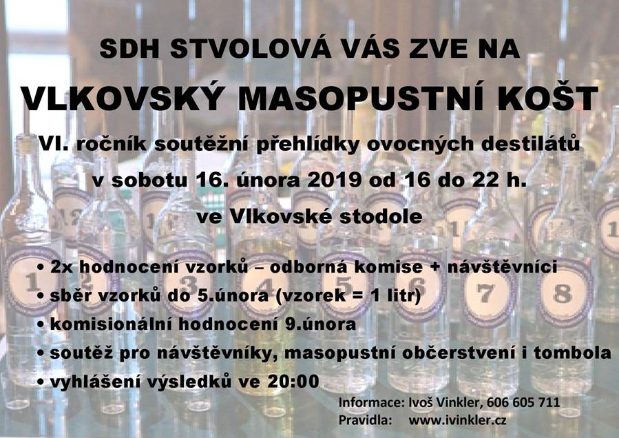 SDH Stvolová zve všechny na VI. ročník soutěžní přehlídky ovocných destilátů - Vlkovský masopustní košt.