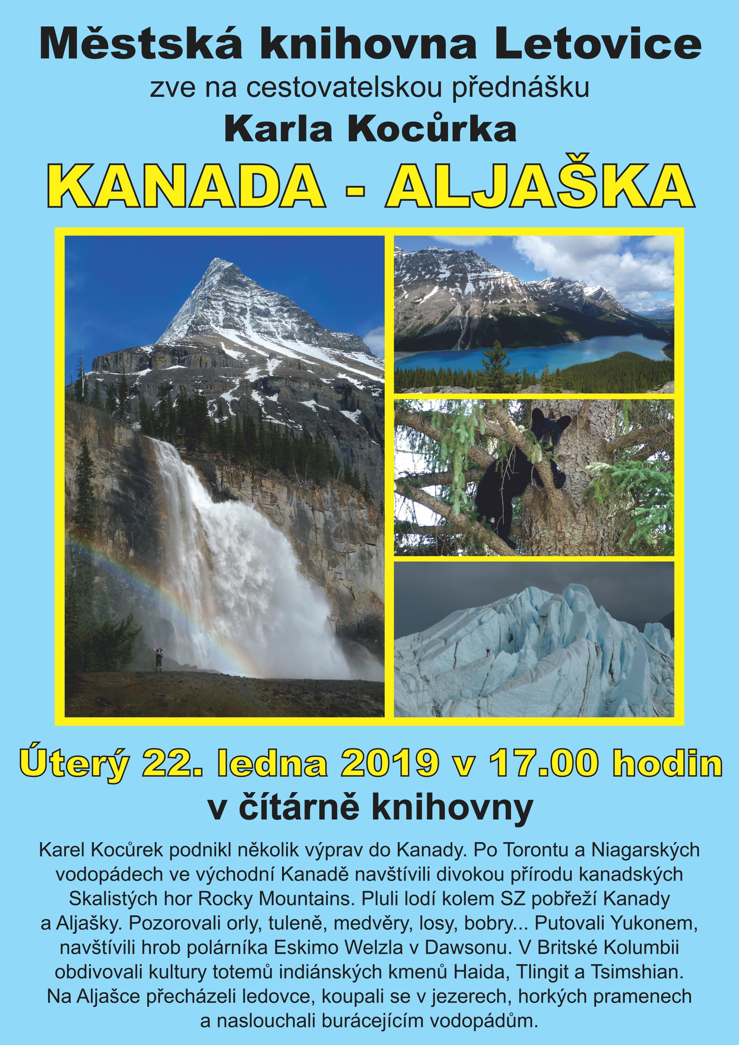 Karel Kocůrek podnikl několik výprav do Kanady. Po Torontu a Niagarských vodopádech ve východní Kanadě navštívili divokou přírodu kanadských Skalistých hor Rocky Mountains. Pluli lodí kolem SZ pobřeží Kanady a Aljašky. Pozorovali orly, tuleně, medvěry, losy, bobry...Putovali Yukonem, navštívili hrob polárníka Eskimo Welzla v Dawsonu. V Britské Kolumbii obdivovali kultury totemů indiánských kmenů Haida, Tlingit a Tsimshian. Na Aljašce přecházeli ledovce, koupali se v jezerech, horkých pramenech a naslouchali burácejícím vodopádům.