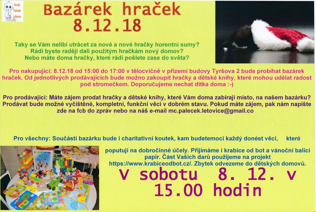 Pro nakupující: 8.12.18 od 15:00 do 17:00 v tělocvičně v přízemí budovy Tyršova 2 bude probíhat bazárek hraček. Od jednotlivých prodávajících bude možno zakoupit hračky a dětské knihy, které mohou udělat radost pod stromečkem. Doporučujeme nechat dítka doma :-)
