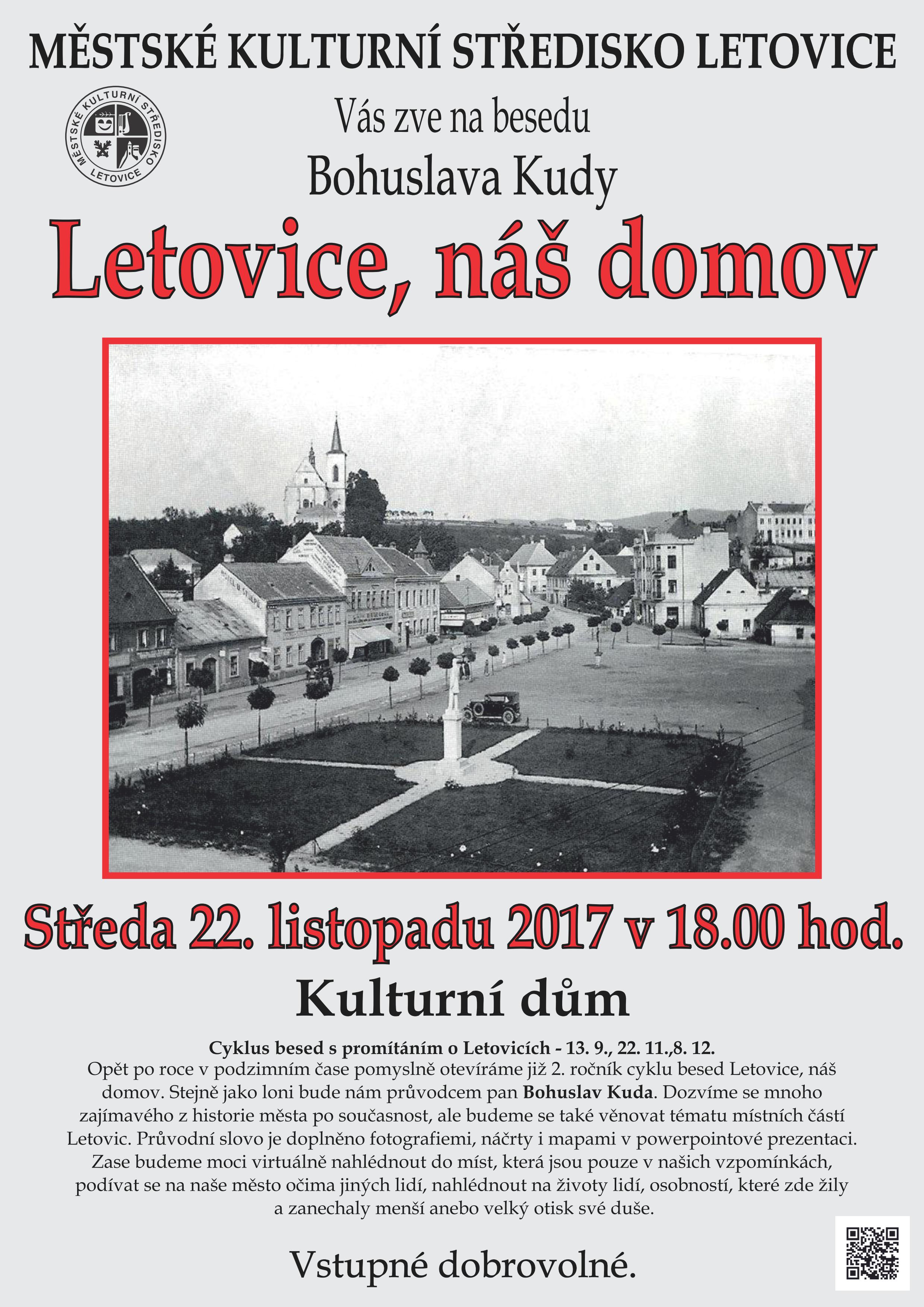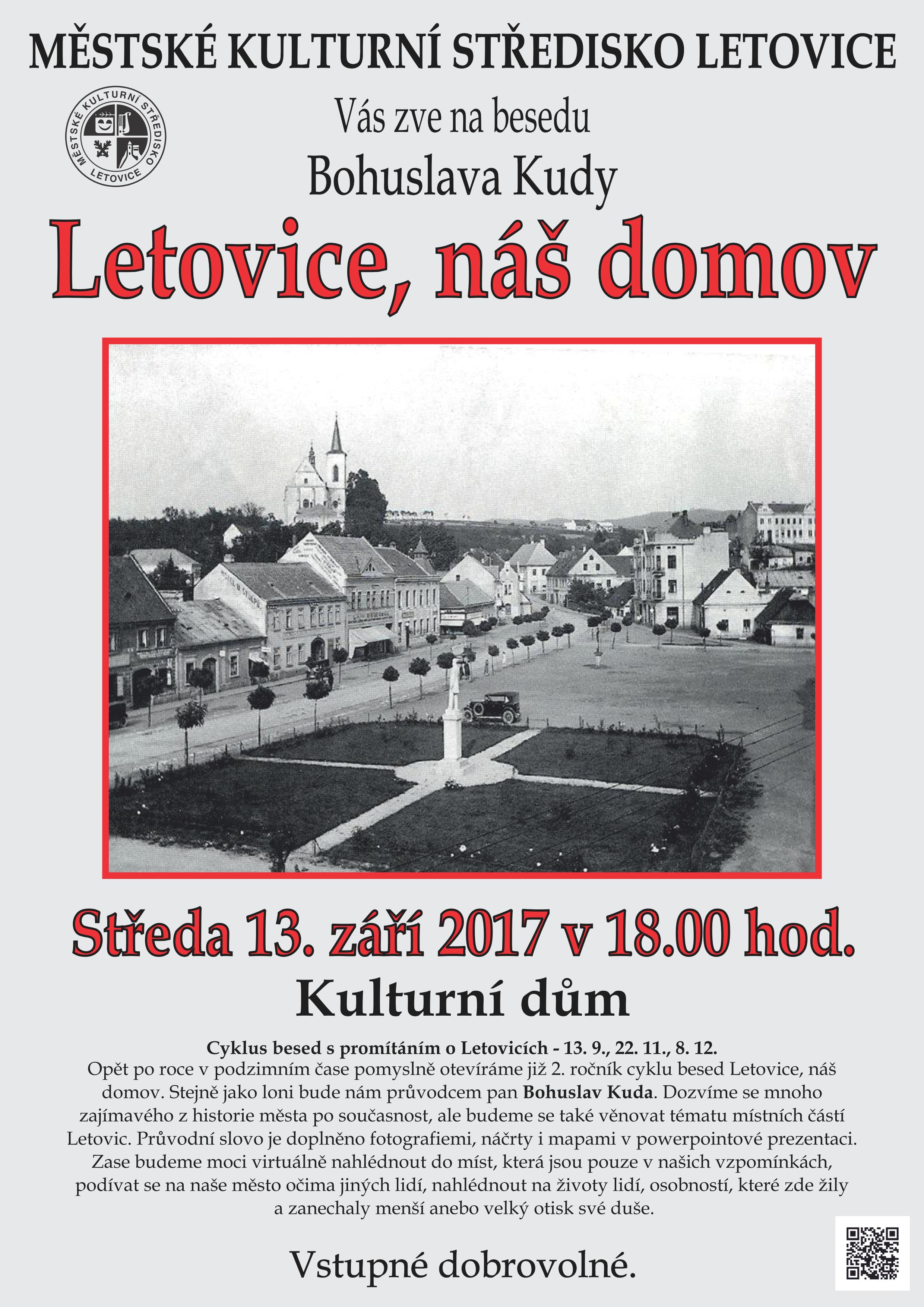 Opět po roce v podzimním čase pomyslně otevíráme již 2. ročník cyklu besed Letovice, náš domov. Stejně jako loni bude nám průvodcem pan Bohuslav Kuda. Dozvíme se mnoho zajímavého z historie města po současnost, ale budeme se také věnovat tématu místních částí Letovic. Průvodní slovo je doplněno fotografiemi, náčrty i mapami powerpointové prezentaci.